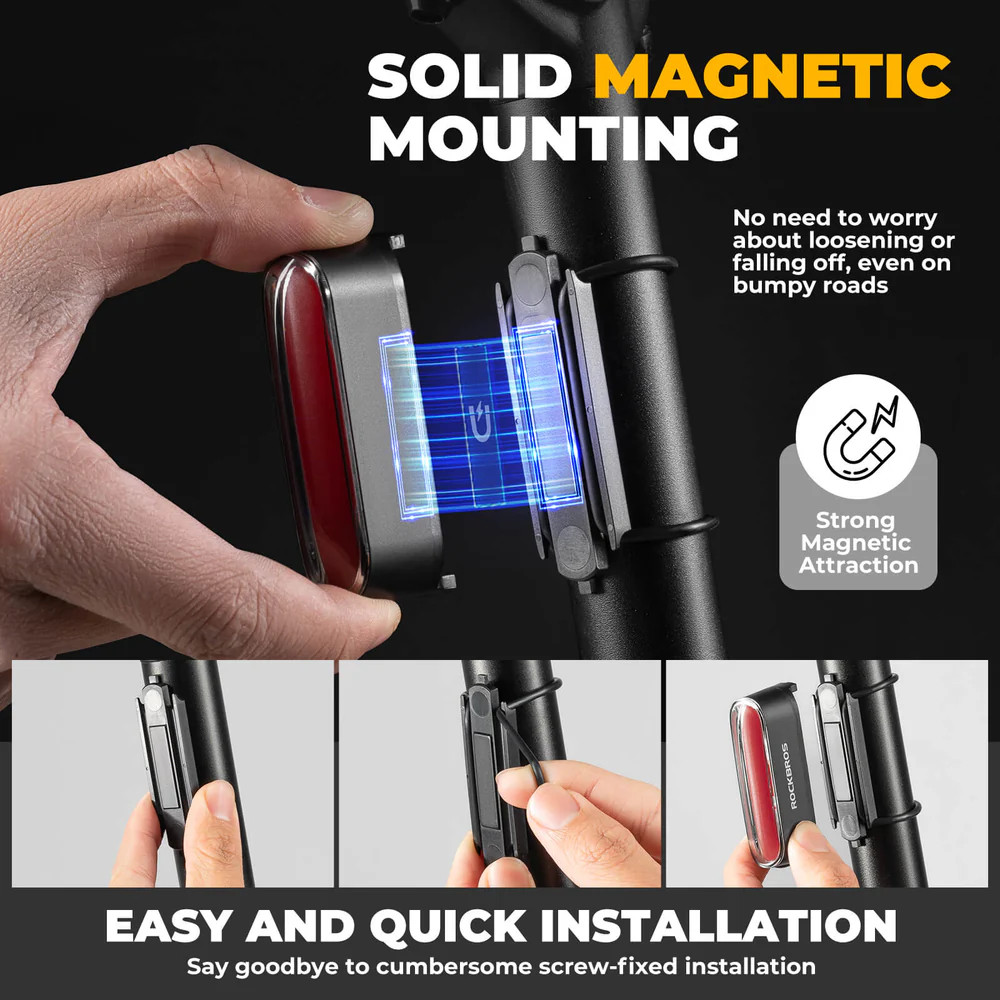 • Fijación magnética y estable: La luz trasera ROCKBROS se instala con un imán, sin herramientas. El imán potente garantiza estabilidad incluso en terrenos irregulares.