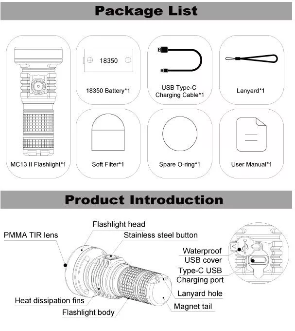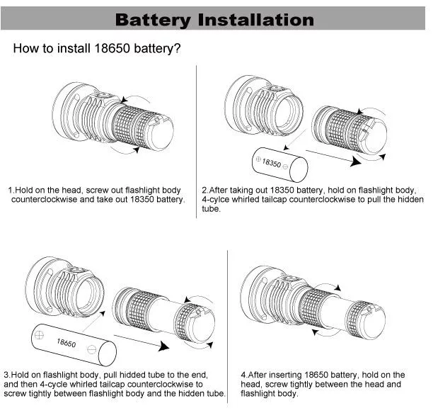 • Alimentado por una batería de iones de litio de alta descarga 18350, compatible con baterías 18650, para proporcionar una mejor autonomía y mayor brillo.