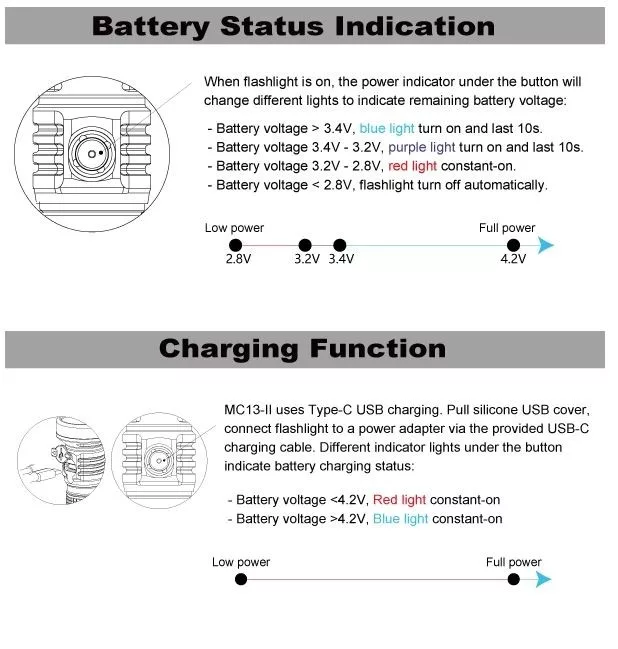 • El indicador de voltaje bajo hace que la luz disminuya a baja luminosidad y evita que la luz se apague accidentalmente en la oscuridad.