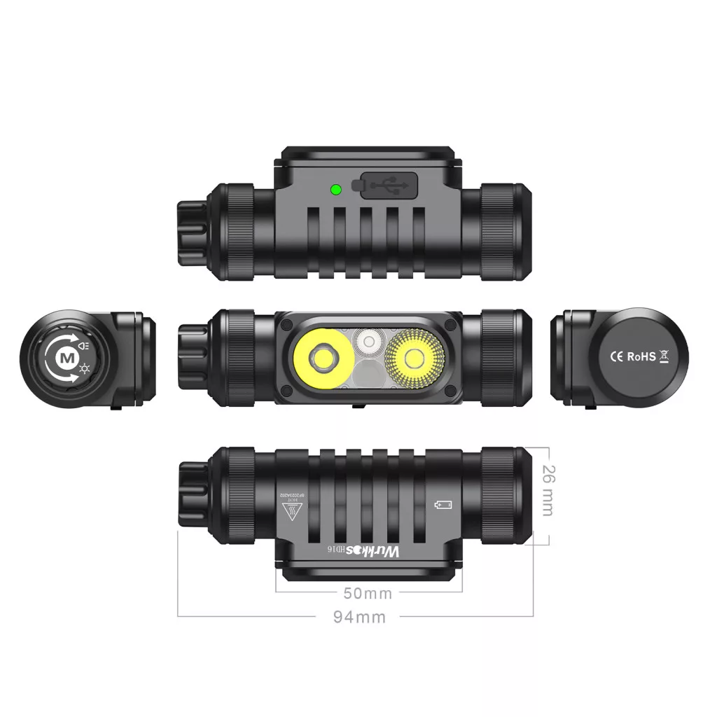 Linterna frontal Wurkkos HD16, salida máxima de 2500 lúmenes, alcance de 297 m, configuración de luz puntual, de inundación y roja, interruptor giratorio conveniente y función de ajuste inteligente de detección de luz