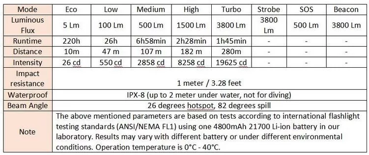 • Cuerpo de la linterna: Aleación de aluminio de grado aeroespacial 6061, fabricado mediante CNC, anodizado duro según la especificación de grado militar tipo III, acabado antiabrasivo para obtener un cuerpo sólido, geometría antichoque y mejor intercambio de calor.