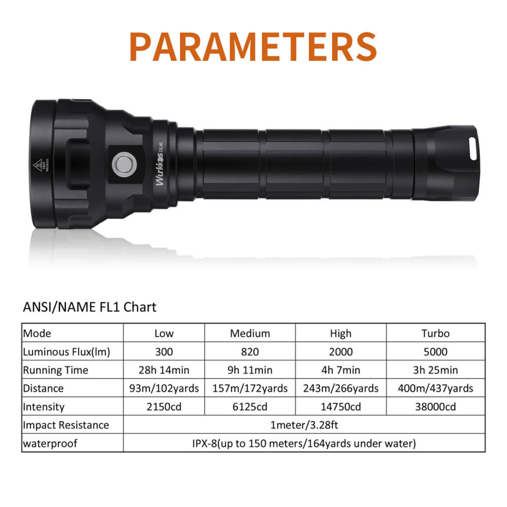 • Cuerpo de linterna: Aleación de aluminio de grado aeroespacial 6061, fabricado mediante CNC con anodizado duro según especificaciones de grado militar tipo III, acabado antidesgaste para obtener un cuerpo sólido, resistente a golpes y mejor intercambio de calor. Lente de vidrio mineral endurecido.