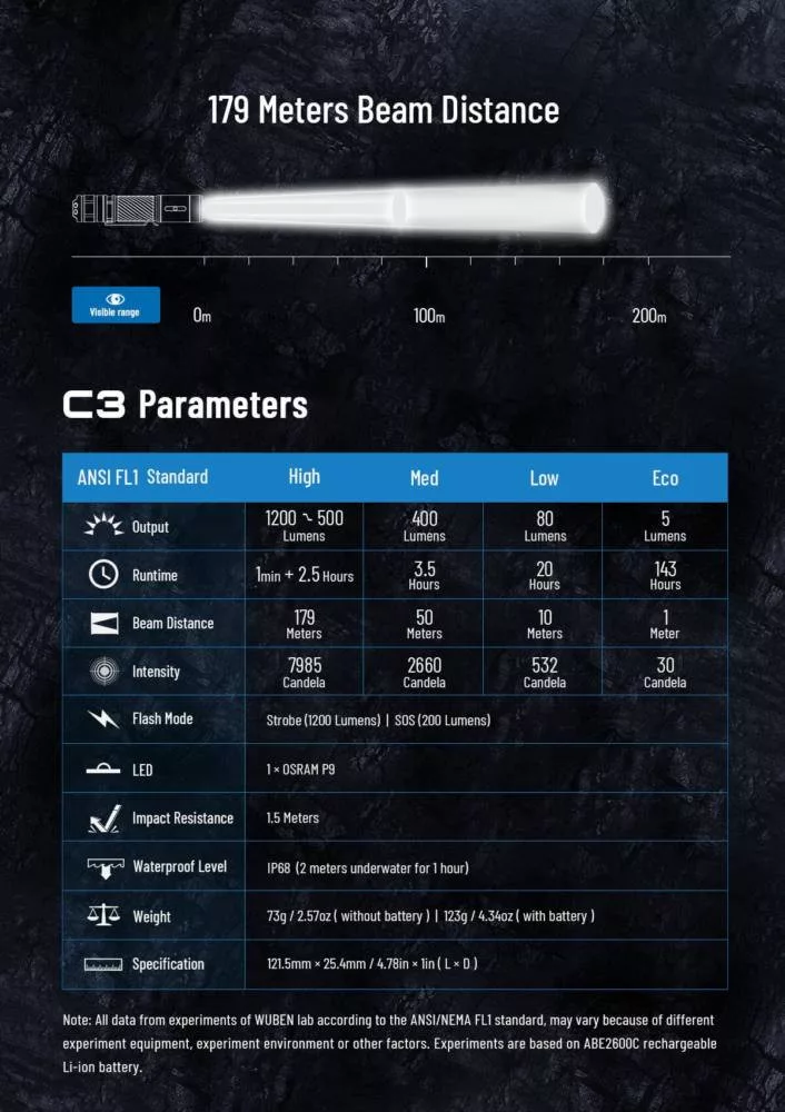 La potente linterna de 1200 lúmenes de WUBEN utiliza una lente convexa para mejorar el brillo general; Una cabeza de lámpara con patrón en espiral aumenta el ángulo de inundación mientras protege la lente. Equipado con un LED OSRAM P9, con una salida máxima de brillo de 1200 lúmenes. 6 modos reemplazan la necesidad de múltiples linternas (alto, medio, bajo, ecológico, estroboscópico, SOS), haciéndola una adición práctica a cualquier hogar o kit de emergencia.