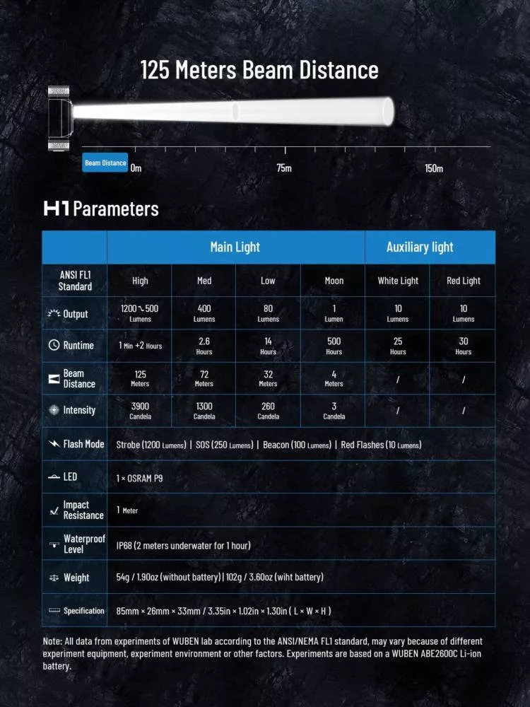 • [????????́???????????? ????????????????????????????????????, ???????????? ???????????????????? & ???????????????????? ????????????????????????????????????] WUBEN H1 funciona con una batería recargable de 2600 mAh, el flujo luminoso es de 1200 lúmenes, la distancia de luz es de 125 metros, el ángulo del haz puede alcanzar los 100 °, Proporcionarle una visión brillante y abierta en la oscuridad.; adecuado para acampar y correr, senderismo, aventura, pesca, lectura, etc.