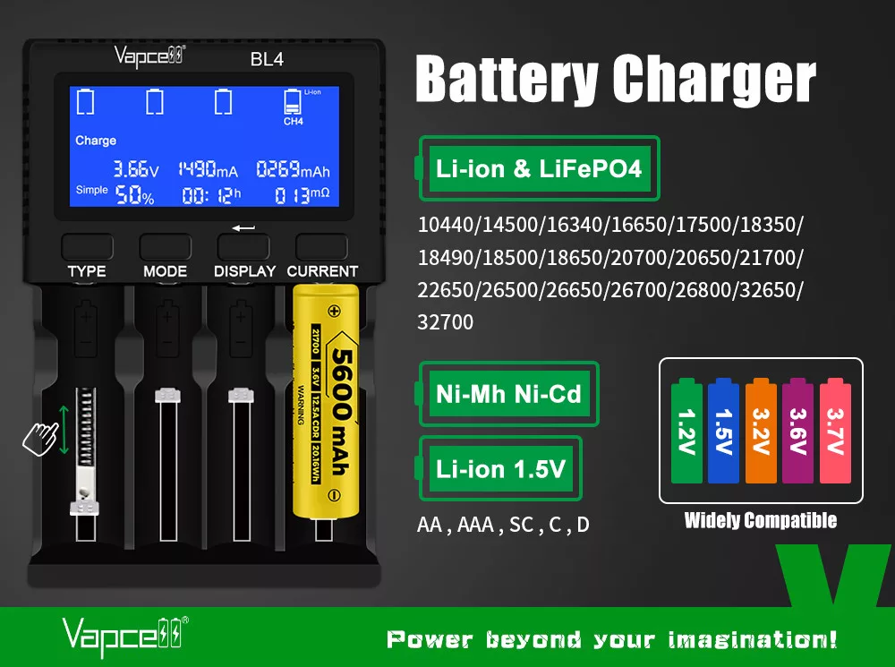 • Li-ion: 16340/10440/14500/18500/18650/21700/26650/26800/32700